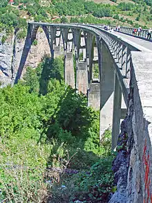 Đurđevića Tara Bridge (pronounced [dʑǔːrdʑɛv̞iːtɕaː târa]) is a concrete arch bridge over the Tara River in northern Montenegro. It is located at the crossroads between Mojkovac, Žabljak and Pljevlja, between the villages of Budečevica and Trešnjica.
