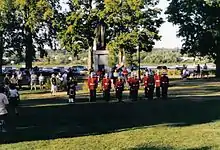 The flank companies had been nearly wiped out during the Niagara campaign and were accorded the honour of wearing the word "Niagara" on their equipment thereafter.[21][12] Some 36 of the less-fit men, mainly those who had been stationed at Cape Breton and Prince Edward Island, were detached and transferred from the regiment in November 1814 into one of the Royal Veteran Battalions.[24] The 104th ended the war in 1815 at Montreal.[23] The unit was awarded the battle honours "Defence of Canada, 1812-1815" and "Niagara, 1814".[25]