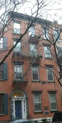 116 Sullivan Street is on Sullivan Street in SoHo, Manhattan, New York. The red four-story brick Federal townhouse was built in 1832 as an investment by Charles Starr (bookbinder) and includes some Greek Revival details. It was heightened two stories in 1872.[1] The structure is noteworthy for its elaborated round-arched brownstone doorcase, or "enframement of the front door," which has an exceptional treatment of painted timber Ionic half-column sidelights, unique and highly significant in New York City architecture. Due to the sidelights, "instead of leaded glass, typical of the time, each sidelight is divided into three superimposed oval sections. The ovals are formed by a richly carved wood enframement that simulates a cloth sash curtain drawn through a series of rings."[2]
