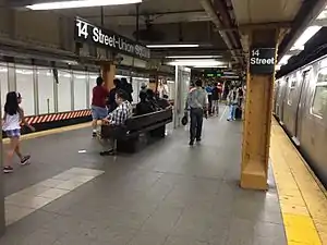 14th Street–Union Square is an express station on the IRT Lexington Avenue Line. The 4 and 6 trains stop here at all times;[56][57] the 5 train stops here at all times except late nights;[58] and the <6> train stops here during weekdays in the peak direction.[57] The station has four tracks and two island platforms. The uptown and downtown platforms are offset from each other, having been extended at their rear ends, and are slightly curved.[4]:5[59] Platform gap fillers, on the downtown side, use proximity sensors to detect when trains arrive, automatically extending when a train has stopped in the station.[4]:5