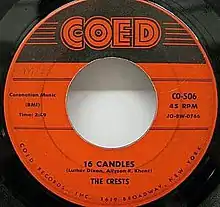 "16 Candles" is a 1958 song performed by The Crests and written by Luther Dixon and Allyson R. Khent.