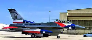 ![]() 182d Fighter Squadron General Dynamics F-16C Block 30F Fighting Falcon 87-255 returning to Lackland Air Force Base after being painted to honor the 65th anniversary of the 182d Fighter Squadron affiliation with the Texas ANG | |