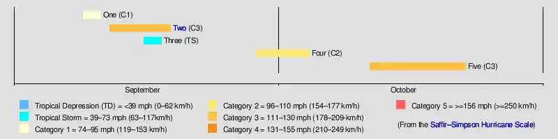 The Atlantic hurricane database (HURDAT) officially recognizes five tropical cyclones for the 1876 season. Four storms attained hurricane status, with winds of 75 mph (119 km/h) or greater. The second and fourth hurricanes of the season were the most intense, with maximum sustained winds up to 120 mph (165 km/h). The first storm of the season was a hurricane that existed for two days in September off the east coast of the United States. Hurricane Two, known as the San Felipe hurricane, was the most notable storm of the season. It formed near the Windward Islands on September 12 and hit Puerto Rico as a Category 3 hurricane before crossing Hispaniola and Cuba. It continued northward to make landfall in North Carolina and continued through the interior of the United States as far as Cape Cod. It caused extensive damage in both Puerto Rico and North Carolina. The third cyclone of 1876 was a tropical storm, known to have existed for two days in the mid-Atlantic. The next cyclone, Hurricane Four, crossed from the Atlantic to the Pacific, passing over Nicaragua in late September and early October. The final storm of 1876 developed north of Panama and proceeded north across Cuba and Florida before dissipating on October 23.[4]