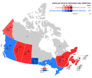 | Liberal | Wilfrid Laurier | 213 | 137 | 133 | -2.9% | 570,311 | 48.87% | -2.01pp | |