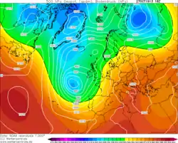 A rapidly deepening low-pressure extratropical cyclone tracked quickly south on the afternoon of 27 October. The central pressure of the system was 990 millibars (29 inHg) at midnight on the 27th,[7] deepening to 975 millibars (28.8 inHg) by 18:00.[8] The low pressure helped to sustain a stream of strong southerly winds, as in days previous,[9] sustaining significantly warmer than average conditions. Temperatures were widely reported over 21 °C (70 °F) in places.[10] Active weather fronts arriving from the Atlantic ocean resulted in the instability needed to cause such tornadoes. The low pressure brought cooler air to the country by the 31st.[11]