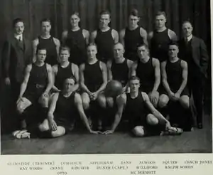 Coached by Ralph Jones, the 1914–15 Fighting Illini men's basketball team became the first undefeated Big Ten champion in the history of the school as well as the fourth Big Ten National Champion.[1] That 1915 season was the third in the eight-year tenure of head coach Ralph Jones and it produced the only unbeaten season in Illini history and the first Big Ten title for the Illinois basketball program. The Illinois team was retroactively named national champions by the Helms Athletic Foundation and the Premo-Porretta Power Poll.[2] Jones’ 1915 team scored twice as many points as its opponents and won the conference title by three games over Chicago. The arrival of the Woods brothers in 1914 had a lot to do with the success of this era. Guard Ray Woods was named first-team All-America all three years he competed (1915–17), and twin brother Ralf, a forward, led the team in scoring in both 1916 and 1917. His consistency at the free throw line led to the establishment of the Ralf Woods Award, which is still given annually to the Fighting Illini player with the best free-throw percentage. The starting lineup included Frank Bane at center, Clyde Alwood and Edward Allan Williford at the forward positions, captain Sven Duner at guard and brothers Ralf Woods and Ray Woods. Ray Woods was named an All-American during this season.[3]