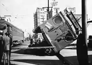 ![]() A red car overturned during the 1919 streetcar strike. | |