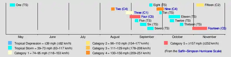 | Fourteen | October 30 – November 14 | Category 5 hurricane | 175 (280) | ≤915 | Leeward Islands, Venezuela, Colombia, Jamaica, Cayman Islands, Cuba, The Bahamas, Bermuda | $40 million | >3,103 | |||