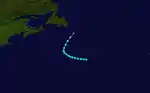 On September 16, a tropical storm with winds of 40 mph (64 km/h) developed out of a frontal boundary in the central North Atlantic.[2][3] Moving slowly towards the northwest,[3] gales were reported by ships in the region as the tropical storm slowly intensified.[2] On September 20, the storm began to move towards the southwest. The system reached peak intensity on September 21, with winds of 65 mph (105 km/h), before transitioning into an extratropical cyclone as it recurved northwards on September 23.[2][3] The extratropical cyclone later made landfall on Nova Scotia the following day, before dissipating over Greenland on September 26.[2]