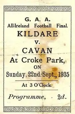 Cavan won by four points after Kildare centre back Jack Higgins was injured. The Lilywhites (Kildare) would not reach the All-Ireland final again for another sixty-three years.[1] They also lost that final, this time to Galway, in 1998.[2][3]