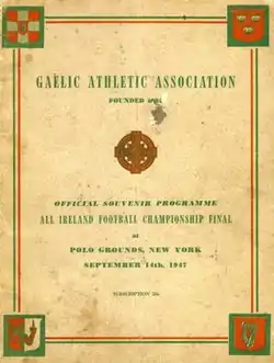 For the first and only time, the final was played outside Ireland, at the Polo Grounds in New York City, to cater for the large Irish-American community there. The New York final was also intended to observe the centenary of the Great Famine that triggered mass Irish emigration to the U.S. and other countries.[2] Around 30,000 people were in the ground for the final.[3] Cavan travelled by air and Kerry by sea; the Cavan team credited their victory partially to their shorter time spent travelling. The Cavan team flew via the Azores, taking 30 hours. Kerry's trip by Ocean Liner took far longer.[3]