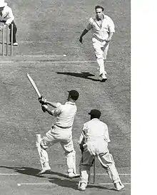 Brown dispensed with the experiment of having Hutton bat down the order and the old Roses opening partnership of Len Hutton and Cyril Washbrook went to the crease. Hutton was full of confidence, 19 runs came off the first three overs and Keith Miller asked for a new ball in the fourth. Umpire Elphinstone examined the ball and changed it for a new one, which he ground into the dust to take the shine off. Hutton insisted on a look and bounced on the grass a few times so that it would lose its shape. It made no difference as another 8 runs came of the next two overs and Miller was taken off, only to take a diving catch off Ian Johnson (3/94) to dismiss Washbrook. Miller said this was the finest catch of his career; "He played the perfect cut, but, fielding in the gully, I had anticipated the shot. I ran across before he played it, flung out my hand and held the ball. I was just as astonished as Cyril".[69] Hutton (62) and Simpson (49) took the score to 128/1 when Miller was brought back on to bowl one of his most famous overs. He bowled a "super ball" to dismiss Hutton lbw and bowled Denis Compton for a duck when the ball clipped the edge of the bat and ricocheted into the stumps. Gilbert Parkhouse survived until tea, but Reg Simpson guided another ball from Miller to Sam Loxton at short-fine-leg and England were 137/4. The popular Freddie Brown strode out to the applause of the crowd hoping for some more Melbourne-style big-hitting and they were not disappointed. Hassett took the new ball, but Brown hit Bill Johnston to the fence, lofted Lindwall into the deep and cracked a straight-drive onto Umpire Barlow's foot. He added 50 with Parkhouse (25) before the Welshman pulled Ian Johnson to Arthur Morris at mid-on at 187/5. He was replaced by Trevor Bailey who held up one end while Brown scattered the in-field and clouted the Australian bowling round the ground. When he was finally out the next day, playing over a yorker from Ray Lindwall for 79, he had made his highest Test score, the highest for England so far in the series, and received a royal reception from the crowd. England was now 258/6, their highest innings of a low scoring series, but without their fiery captain they collapsed to 290 all out. Bailey had his thumb broken by a Lindwall bouncer at 263/6 and was taken to St Vincent's Hospital. Godfrey Evans struck 3 fours in his 23 not out, but Alec Bedser was bowled by Lindwall (2/60) and John Warr by Miller (4/37). Bailey returned at 281/8 and tried to bat one-handed before he was caught by Don Tallon of Ian Johnson. Doug Wright joined Evans, but was run out for a duck by his Kent team-mate, tripping over his bat and pulling a muscle as he rushed home and England were all out for 290.[70][71][72]