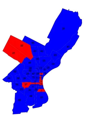 ![]() Ward-level results in the mayor's race, with Dilworth in blue and Longstreth in red | |||||||||||||||||