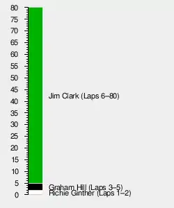 - Richie Ginther 2 laps (1-2); Graham Hill 3 laps (3-5); Jim Clark 75 laps (6-80).