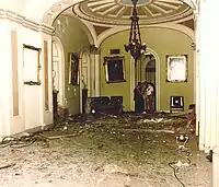 The force of the device, hidden under a bench at the eastern end of the corridor outside the Chamber, blew off the door to the office of Democratic Leader Robert C. Byrd. Senator Byrd was an active supporter of involvement in Grenada, and had recently made attempts to garner support for retaliating against recent attacks against U.S. Marines stationed in Lebanon. His recent actions may have drawn attention from the terrorist group, and led to his targeting. Furthermore, the blast also punched a hole in a wall partition, sending a shower of pulverized brick, plaster, and glass into the Republican cloakroom. The explosion caused no structural damage to the Capitol. The force shattered mirrors, chandeliers, and furniture. Officials calculated damages of $250,000 (equivalent to $640,000 in 2019).[2]