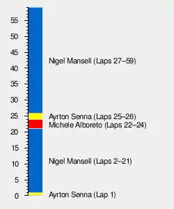 On lap 22, Mansell pitted early due to a loose wheel balance weight and for three laps Alboreto led the race to the delight of the Tifosi. Senna retook first position with Alboreto's pit stop, then before Mansell returned to the front when the Brazilian stopped. Riccardo Patrese in his Brabham BT56 was now holding second place but he retired when his alternator failed on lap 57. Simultaneously, Teo Fabi retired with engine problems. Fabi's race had been wrecked by front wing damage sustained on the first lap when he collided with Cheever, although his attempted fightback did produce the fastest lap.