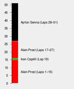 The all-McLaren front row was the 11th of the year, but its drivers had contrasting fortunes. Prost led away from Berger and Capelli, while Senna stalled on the grid. However, Suzuka had the only sloping grid of the year and so the Brazilian was able to bump start his car into action. He had dropped to 14th place, but immediately made a charge through the field, gaining six places by the end of the first lap and then passing Riccardo Patrese, Thierry Boutsen, Alessandro Nannini and Michele Alboreto to run fourth on lap 4. Meanwhile, Derek Warwick and Nigel Mansell collided and had to pit for a puncture and a new nose cone, respectively, while Capelli not only set the fastest lap but also passed Berger – who was already troubled with fuel consumption problems – on lap 5 to move into second place. Alboreto spun out while he was in sixth place.