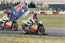 Mick Doohan, celebrating his second 500cc title after winning the race. Behind him is Shinichi Ito, who finished ninth.