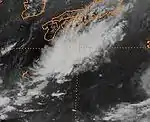 The second tropical depression of the season developed out of a tropical disturbance which was first noted 1,080 km (670 mi) north-northwest of Palau on July 6. The disturbance gradually became better organized and was classified as Tropical Depression 01W at 1500 UTC on July 7. Upon becoming a depression, it marked the latest start for a Pacific typhoon season since reliable records began in 1959.[3] The next day, 01W entered the Philippine Atmospheric, Geophysical and Astronomical Services Administration (PAGASA) area of responsibility and received the local name Akang.[4] Slowly moving towards the northwest, the depression neared Taiwan. However, increasing vertical wind shear caused the convection associated with the depression to become displaced from the center of circulation. With the center exposed, 01W weakened. At 2100 UTC on July 10, the depression made landfall in northern Taiwan and dissipated shortly after. No known damage was caused by the depression.[3]