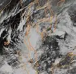 As 01W intensified over the Philippine Sea,[3] a broad area of low pressure developed in the South China Sea. The low slowly intensified as it moved towards the north-northeast and was declared Tropical Depression 02W early on July 8. Tropical Depression 02W slowly strengthened as northerly outflow was constricted. By late on July 8, the depression was upgraded to a tropical storm and given the name Nichole. The storm reached its peak intensity while just offshore southern Taiwan with winds of 95 km/h (60 mph 1-minute winds) according to the Joint Typhoon Warning Center (JTWC)[3] and 65 km/h (40 mph 10-minute winds) with a minimum pressure of 998 hPa (mbar) according to the Japan Meteorological Agency (JMA).[5] The combination of dry air, strong wind shear, and the storm's proximity to land caused Nichole to quickly weaken to a tropical depression twelve hours after reaching its peak intensity. The exposed remnants of Nichole executed a clockwise-loop offshore Taiwan before traveling north into mainland China and dissipating.[3] Rough seas produced by the storm caused four container ships to run aground in Taiwans' Kaohsiung Harbor, none of the crew members were injured. Heavy rains in Taiwan flooded an estimated 2,500 acres (10 km2) of crops.[6]