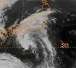 In northern Japan, near Wakkanai, Hokkaidō, severe damage to many homes took place. One person in the region was killed after being blown off his roof while trying to repair it and twelve homes were destroyed. Several rivers overflowed their banks after rainfall exceeding 200 mm (7.9 in) fell across Hokkaidō. Throughout Sōya Subprefecture, agricultural and fishing industry losses amounted to 23.1 million yen (US$171,213).[16] Severe flooding took place in nearby Abashiri Subprefecture where hundreds of homes were inundated after rivers broke their banks. Over 6,200 ha (15,000 acres) of farmland was lost. Large sections of roadways were washed away, including 14 bridges. Total losses in Abashiri reached 25 million yen (US$185,296), much of which was due to fishing industry damage.[17]