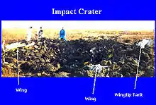Impact occurred approximately 1713Z, or 1213 local, after a total flight time of 3 hours, 54 minutes, with the aircraft hitting the ground at a nearly supersonic speed and an extreme angle.[6] The Learjet crashed in South Dakota, just outside Mina in Edmunds County, on relatively flat ground and left a crater 42 feet (13 m) long, 21 feet (6.4 m) wide, and 8 feet (2.4 m) deep. None of its components remained intact.[1]