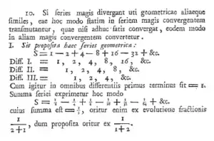 Leibniz did not quite assert that the series had a sum, but he did infer an association with 1/3 following Mercator's method.[1][2] The attitude that a series could equal some finite quantity without actually adding up to it as a sum would be commonplace in the 18th century, although no distinction is made in modern mathematics.[3]