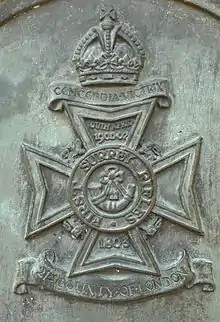 Following the Childers Reforms the 1st Surrey RVC became the 1st Volunteer Battalion of the East Surrey Regiment on 1 July 1881, but without changing its title.[3][4][6][10] Under the Stanhope Memorandum of December 1888 the battalion was assigned to the Surrey Volunteer Infantry Brigade, whose place of assembly in case of war was at Caterham to man the outer London Defence Positions. By 1907 the brigade had been split into separate East and West Surrey brigades, the 1st Surrey Rifles forming part of the East Surrey Brigade based at Worplesdon.[11][12][13] Volunteers from the unit served in the 2nd Boer War, earning the Battle honour South Africa 1900–02.[14]