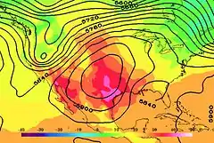 ![]() MERRA2 data showing 2-meter temperature (in °C) and 500-millibar height fields at 7 p.m. CDT on September 5, 2000. | |