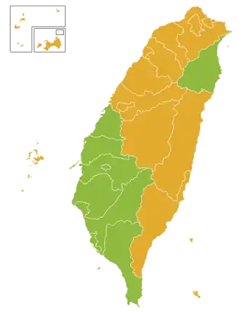 ![]() Vote leader in county-level districts. Green: Chen-Lu ticket; orange: Soong-Chang ticket | |||||||||||||||||||||||||