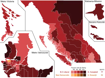 | Liberal | Gordon Campbell | 79 | 33 | 77 | +133.3% | 916,888 | 57.62% | +15.80% | |