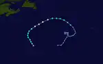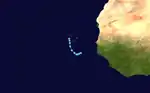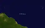 Initially, the depression was forecast to attain tropical storm status, maintaining good outflow and some banding features around the system.[31] Around 0900 UTC on June 11 satellite-based intensity estimates indicated the depression was near tropical storm status.[34] However, the convection subsequently diminished and became displaced to the northeast of the center, and late on June 11 the depression degenerated into an open tropical wave about 950 miles (1,530 km) east-southeast of Barbados.[28] The tropical wave remained well defined with a well-defined low-level vorticity, though strong wind shear prevented tropical redevelopment.[35] On June 13 its remnants passed through the Lesser Antilles, and the wave continued westward through the Caribbean Sea.[36]