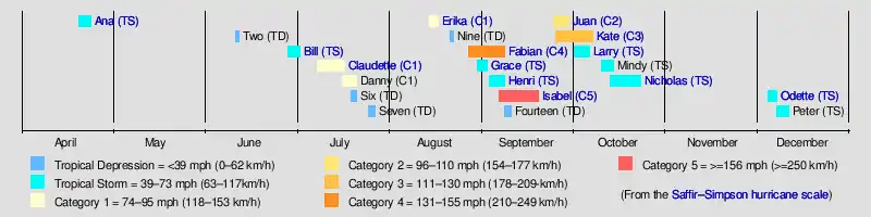 The season began with Subtropical Storm Ana on April 20, prior to the official start of the season; the bounds of the season are from June 1 to November 30, which ended in December 11 conventionally delimit the period of each year when most tropical cyclones form in the Atlantic basin. In early September, Hurricane Fabian struck Bermuda as a Category 3 hurricane, where it was the worst hurricane since 1926; on the island it caused four deaths and $300 million in damage (2003 USD). Hurricane Juan caused considerable destruction to Nova Scotia, particularly Halifax, as a Category 2 hurricane, the first hurricane of significant strength to hit the province since 1893. Additionally, Hurricanes Claudette and Erika struck Texas and Mexico, respectively, as minimal hurricanes. In December, Tropical Storm Odette struck the Dominican Republic, and Tropical Storm Peter formed in the eastern portion of the basin.