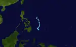 On January 11, the JTWC began monitoring the disturbance that would eventually develop into Yanyan near the International Date Line. As the system tracked westward, it gradually moved into a more favorable environment for tropical cyclogenesis. On January 14, surface observations indicated that the low-pressure area had developed a closed, low-level circulation center indicative of a tropical cyclone, satellite imagery remained inconclusive.[29] Nonetheless, the JMA classified the pressure area as a tropical depression west of the Marshall Islands at 0600 UTC on January 15.[12] The JTWC would follow suit by classifying the storm as such at 1800 UTC later that day. At the time, the depression was tracking west-northwest under the influence of a subtropical ridge to the north.[13] Over the next day the system waned in convective activity before resuming its previous track and accelerating. At 0000 UTC on January 17, the JTWC upgraded the system to tropical storm intensity, though the storm remained nameless as the JMA continued to classify it as a tropical depression.[12][29]