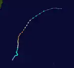 Kujira developed from a broad area of disturbed weather as a tropical depression on April 9 well removed from any landmasses.[13] Shortly after development, Kujira quickly intensified in its early stages, and was upgraded to a tropical storm just two days after cyclogenesis. Strengthening slowed afterwards, though the storm attained typhoon intensity on April 14. Intensification continued and late on April 15, Kujira reached its peak intensity with winds of 165 km/h (105 mph) and a minimum barometric pressure of 930 mbar (hPa; 27.46 inHg).[12] Following peak intensity, Kujira would begin to track northwest and oscillate in strength, cresting an additional two times in intensity. On April 21, the typhoon was downgraded to tropical storm intensity and began to track erratically for several days east of Taiwan. However, on April 24, Kujira would resume a northward track and begin to weaken, and on April 24 was downgraded to tropical depression strength as it made landfall on Kyushu.[13] Following landfall, Kujira transitioned into an extratropical cyclone on April 25, which persisted until crossing the International Dateline towards the end of April 2003.[16]