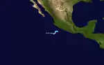 The origins of Emilia were from a tropical wave that developed into a tropical depression on July 21, a short distance off the coast of Acapulco. It moved generally north-northwestward, reaching tropical storm status on July 22 and passing about 175 mi (280 km) southwest of Manzanillo, Colima.[36] An eyewall began to form that day,[37] and Emilia reached peak winds of 65 mph (105 km/h).[36] It briefly weakened due to wind shear, although restrengthening occurred as the storm turned toward the Baja California peninsula. On July 26, Emilia again reached peak winds of 65 mph (105 km/h), and shortly thereafter it passed about 60 mi (95 km) southwest of the southern tip of Baja California. It weakened as it turned into cooler waters, first to tropical depression status on July 27 and then to a convective-less remnant low on July 28. The remnants dissipated on July 31 about 495 mi (800 km) west-southwest of San Diego, California.[36]