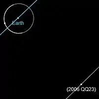 2006 QQ23[lower-alpha 1] is a sub-kilometre asteroid, classified as a near-Earth object of the Aten group that is potentially hazardous only as the orbit evolves over millennia. It was first observed on 21 August 2006 by the Siding Spring Survey.[1][2] On 10 August 2019, the object safely passed 7.4 million kilometres (4.6 million miles) from Earth.[5][6] With a 12 year observation arc it has a well determined orbit and is not a threat for the foreseeable future.[5]
