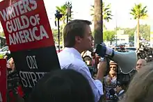 ![]() Striking WGA members at Fox Plaza, Los Angeles, on November 7, 2007 | |||