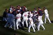 However, their home opener, as well as the remainder of a four-game series with the Seattle Mariners, was postponed due to heavy snow. After a discussion about a possible relocation of the following series between the Indians and the Angels to Anaheim,[3] the Indians decided to relocate the three-game series to Miller Park in Milwaukee.[4] The three-game series averaged a surprising 17,498 fans in attendance, and featured several homages to the fact that the film Major League was shot in Milwaukee, including closer Joe Borowski entering the game to "Wild Thing".