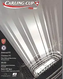 Both clubs received an allocation of approximately 30,000 tickets. The competition sponsor Carling gave up its allocation; they instead invited 200 fans of Arsenal and Chelsea to be seated in their suite.[29] Supporters of the four semi-final clubs were invited to participate in the "Carling Cabniet"; this gave them the opportunity to have their say about the matchday experience.[30] Ticket prices for adults were priced £36, £48, £64 and £74, with concessions for juniors and seniors.[31] For every ticket sold, the Football League gave £1 to Children in Need; the donation came at a total of £70,000.[30]