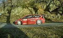 After being absent from the WRC for the 2006 season to spend thirteen months concentrating on preparing their new Citroën C4 WRC vehicle, the Citroën Total World Rally Team returned in 2007 ready to début it in the Monte Carlo Rally. The Citroën Xsara WRC had dominated the championship in recent years, and despite its age it was still incredibly reliable and was only replaced because the Xsara model was no longer in production.[14] The C4's mechanical components, such as the engine, transmission, differentials and suspension were either very similar to, or came from, the Xsara,[15] but the wheelbase and chassis were longer by 253 millimetres (10.0 inches) and 107 mm (4.2 in), respectively, which meant that under WRC rules the C4 could be widened to 1,800 mm (71 in).[14] It was also higher than the Xsara, and the weight distribution had been fine-tuned, including raising and moving back the front seats (which had the negative effect of reducing the drivers' visibility), and attaching the wing mirrors to the midpoint along the front doors.[15][16] The C4's test drivers reported that the car handled more stably.[14]