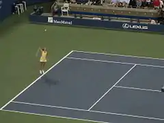 On women's semifinal day it was the two former World No. 1s, Jelena Janković and Serena Williams, who came through in blustery conditions. For Janković, it was the first time she had reached the final of a Grand Slam, having made the semi-finals on four previous occasions. She was also the third Serb to reach a Grand Slam final in 2008 (men's and women's singles),[75][76] making them the most successful nation in this regard. She progressed first, defeating Elena Dementieva 6–4, 6–4. Dementieva was in the ascendency in the early part of the match, as she broke serve to lead 4–2 and dictated the play from the baseline. However, Dementieva began to hit more unforced errors at this point, and Janković took advantage of this, winning the next four games to secure the first set. On set point, which was on Dementieva's serve, Janković caused a minor controversy when she asked the ball boy for a towel, thus exceeding the 25 second time limit between points; she received a code violation (warning) from the umpire as a result of this incident.[77] Both players struggled to hold serve in the early stages of the second set, and they traded two breaks apiece from 1–1 to 3–3. Both players then held serve to 4–4, before Janković broke at 5–4 to win the match.[78] Dementieva had problems throughout the match; she was broken on serve five times,[79] and committed forty-two unforced errors in total. However, she said that her recent Olympic triumph provided more than mere consolation, as she assigned a higher worth to the Olympic tennis event. Janković, who was in tears at the end of the match, had suffered a spate of injuries in 2008, and claimed that this was the first tournament of the year that she was injury free.[77] Williams also won in two sets, defeating Dinara Safina 6–3, 6–2. Safina broke Williams in the first game of the match, but Williams soon asserted herself, and after having broken back, broke again to lead 5–3. Although Williams faced break points in this game, she eventually came through to win the first set. Safina, who was troubled by the wind for the whole match, was then broken after being 40–0 up in the first game of the second set. Williams eased to a 5–1 lead before closing out the match with a big serve. Williams told afterwards of her excitement of having an American player back in the final (the last women's singles final to feature an American woman was 2002, when, as previously mentioned, she and her sister played each other). Safina meanwhile, chastised her own behavior on the court, saying that she acted like a "spoilt girl" and would in the future try to contain her emotions.[80]