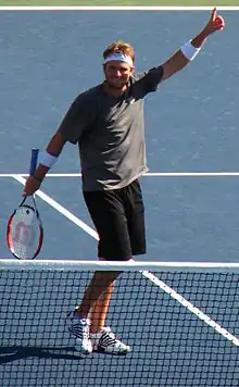 On Day 9, two of the top three seeds, and the two finalists from the previous year, Roger Federer and Novak Djoković, were severely tested. Federer, aiming for his fifth consecutive Open title, was playing twenty-sixth seed Igor Andreev in one of the scheduled night matches on the Arthur Ashe Stadium;[57] he was victorious in five sets, 6–7(5), 7–6(5), 6–3, 3–6, 6–3. Federer struggled to break Andreev's serve in the opening two sets, whereas Andreev broke Federer in the first game of the first, and had seven break points in the early games of the second (Andreev had a low success rate overall, only taking advantage of two out of fifteen break points in the whole match). In the final set Andreev, at 4–2 down, had five further break point opportunities, but failed to convert any as Federer served out the match. Djoković was also pushed to five sets, defeating fifteenth seed Tommy Robredo 4–6, 6–2, 6–3, 5–7, 6–3 in nearly four hours. Robredo broke Djoković's serve at 4–4 the first set, before Djoković won sets two and three with some ease. However, after having broken serve in the fourth, Robredo levelled the match at 3–3, prompting the number three seed to smash his racket, and be the subject of booing from sections of the crowd. Djoković failed to convert break points at 5–5, allowing Robredo to forge a break of his own and take it to a fifth set. Djoković was able to close out the match after breaking at 2–2 in the final set. Djoković was beset by problems related to both a hip injury (for which he required two time-outs) and exhaustion, having been unable to sleep until 4.30 am (UTC-5) on Day 8 after his match with Marin Čilić. Robredo responded by saying, "I think that if you're not fit enough, then don't play." Djoković set up a tie with sixth seed Andy Roddick, who easily beat eleventh seed and Olympic silver medalist Fernando González 6–2, 6–4, 6–1; 2003 champion Roddick acknowledged that he would have to complete an upset to defeat Djoković, despite Djoković's admission that whomever he faced in the next round would be a fitter opponent.[58][59][60] Gilles Müller continued his unexpected run, as he defeated fifth seed Nikolay Davydenko in a demanding match that finished 6–4, 4–6, 6–3, 7–6(10). Müller, who served twenty aces, became the lowest-ranked player, at world number 130, to reach the quarterfinals of the Open since Nicolas Escudé (rank 136) in 1999, and the lowest-ranked at a Grand Slam tournament since Alexander Popp (rank 198) at Wimbledon 2003. He was also the first Luxembourgian to reach the quarterfinal stage of a Grand Slam.[61]
