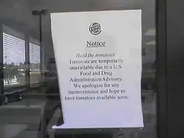 On June 3, in response to early case-control studies, the U.S. Food and Drug Administration (FDA) issued an advisory recommending that consumers in New Mexico and Texas avoid eating some types of raw tomatoes. On June 7, they expanded this advisory to include consumers nationwide.[5] On July 9, the FDA issued a similar nationwide advisory not to consume raw jalapeño peppers. On July 30, this recommendation was narrowed to peppers grown or packed in Mexico.[5]