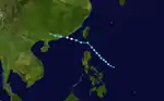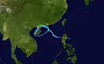 Late on July 7, the JTWC reported that an area of disturbed weather had formed about 900 km (560 mi) to the northwest of Yap. Deep convection was embedded in a broad, weak, poorly defined circulation that was starting to be enhanced by a Tropical Upper Tropospheric Trough (TUTT) cell to the east of the system.[80] Over the next couple of days, gradual development took place before a TCFA was released by the JTWC early on July 9 as PAGASA designated the system as Tropical Depression Gorio.[81][82][83] Later that day both the JMA and the JTWC reported that the depression had formed and started to issue warnings on the depression, with the JTWC designating it as 05W.[84][85] On July 10, PAGASA issued their final advisory on Tropical Depression Gorio as it moved out of their area of responsibility.[86] Hampered by an unfavorable upper-level environment, the depression barely intensified into a tropical storm early on July 11.[87] Upon becoming a tropical storm, the JMA named the system Soudelor reporting peak winds of 65 km/h, (40 mph).[85][88] Later that day the JTWC reported that Soudelor had weakened into a depression; however they re-upgraded it to a tropical storm as it moved closer to Hainan Province.[89][90] Shortly before landfall in Leizhou Peninsula, China, the JTWC downgraded the storm to a tropical depression, then as Soudelor moved back over water and into the Gulf of Tonkin, the JTWC issued their final advisory on the depression, however the JMA continued to monitor the storm until it had made landfall near Fangchenggang, China several hours later.[91][92][93]