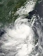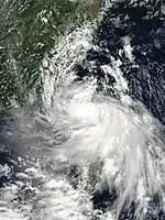 On April 29, the JTWC reported that an area of deep convection had persisted near the center of an elongated low-level circulation center, in area of low vertical windshear, about 400 km (250 mi), to the west of Manila in the Philippines. Deep convective banding was curving into an eastern southern edges of the disturbance.[33] During the day the disturbance gradually consolidated further under the influence of an anticyclone, as a result of this the JTWC issued a tropical cyclone formation alert on the system.[34] Early the next morning PAGASA upgraded the disturbance to a tropical depression and named it as Crising as it reached its 10-minute peak windspeeds of 55 km/h (35 mph).[35] Later that day the JTWC reported that Crising's low-level circulation center has weakened and was now poorly organized as it underwent a Fujiwhara effect with what was to become Typhoon Kujira (Dante).[36] PAGASA kept issuing advisories on Crising until it weakened into a low-pressure area early on May 1.[37]