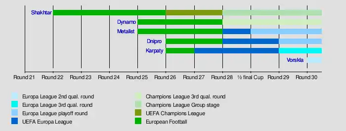 - After the 29th Round, Dnipro Dnipropetrovsk enters the 2011–12 UEFA Europa League in the Play-off round and Karpaty Lviv enters in the Third qualifying round.[35]