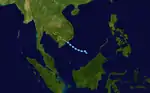 On January 16, a disorganized area of low pressure formed in the south China Sea. The next day, it gradually intensified into a weak tropical disturbance by the JTWC. Early on January 18 the JMA reported that it was upgraded to a tropical depression which had formed within the northeast monsoon about 320 km (200 mi) to the north-west of Bandar Seri Begawan in Brunei.[16] The depression's low level circulation center was partially exposed and located within an area of moderate to strong vertical wind shear.[17] However over the next 12 hours, whilst the depression moved towards Vietnam, the low level circulation center rapidly consolidated and became well defined after the vertical wind shear around the system relaxed.[18] As a result of this the JTWC initiated advisories on the depression, designating it as Tropical Depression 01W.[18] During the next day, the depression weakened with the low level circulation center becoming partially exposed, as it moved over an area of cold sea surface temperatures.[19][20] As a result of this the JTWC issued their final advisory on the system later that day.[21] The depression then made landfall on Vietnam near Gò Công early on January 20 before the JMA then issued their final advisory later that day as the system dissipated over Cambodia.[22][23][24]
