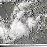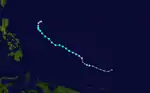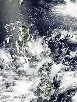 On April 24, an area of low pressure had been formed about 140 km (87 mi) to the west of Palau Island .[34] On the next day, the disturbance start to move westward. On the same time, the disturbance suddenly strengthened and its LLCC began to consolidate as well as significant banding all over the system and located over moderate vertical wind shear. Early of April 26, the disturbance rapidly strengthen again and was starting to be enhanced by a tropical upper tropospheric trough (TUTT) cell to the northeast of the system, whilst the JMA upgraded it into a tropical depression. Later that day, the depression made landfall over Davao City and Surigao del Sur boundary and crossed central Mindanao. Early on April 27, JMA downgraded the depression into an area of low pressure while it was located in vicinity of Sulu Island. In the next couple of days the low pressure start to move northwest towards South China Sea. On the same time, the low pressure crossed Palawan Island on the afternoon of April 29. On the next day, the low pressure was located about 415 km (258 mi) from Manila. In the evening of that day, the low pressure was last seen in vicinity of the Zambales area and was absorbed by a frontal system.[35][36]