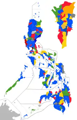 ![]() District election results (80% of the seats), with Metro Manila on the inset, and party-list seats indicated by black boxes.